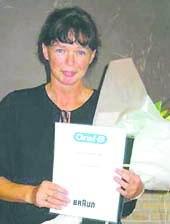 Der var blomster, diplom og et armbåndsur til klinikassistentelev Eva Grud Sørensen, da hun modtog Oral-B prisen for årets bedste opgave om forebyggende tandpleje.