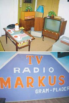 PÃ¥ muséets radioudstilling kan man blandt andet indhente oplysninger om en forretning i Grenaa, der var særdeles kendt i netop 60’erne, men som ikke ret mange mennesker under 40 Ã¥r har nogen som helst erindring om i dag. Resterne af et gavlmaleri pÃ¥ ejendommen Østergade 20 i Grenaa fortæller en lille flig af historien. Gavlmaleriet pÃ¥ Østergade 20 er udført af malerfirma Herluf Hansen, Aagade 17 i Grenaa i forbindelse med, at Markus Radio flyttede ind i den nye biografbygning lige efter indvielsen i 1956. Det var indehaveren, ingeniør Markus, der fik idéen. Han fik navnet malet med en pil, der pegede ned mod forretningen. Med tiden falmede billedet, og en ny og lidt anderledes reklame blev malet oven pÃ¥ den gamle. Efter at Markus Radio i begyndelsen af 70’erne flyttede til Nørregade, blev det hele overmalet med en neutral farve. Siden er denne farve blevet bortvasket af vejr og vind, sÃ¥ledes at sÃ¥vel den ældste som den nyere reklame er blevet synlige. Det har Djurslands Museum udnyttet i sin radioudstilling, hvor Markus-gavlen er blevet rekonstrueret pÃ¥ en væg.