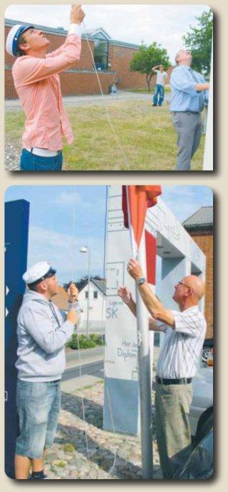 Forbliven i 1. division om søndagen og student på Grenaa Handelsskole om mandagen. Således tog Martin Engbæk Andersens liv sig ud i starten af sidste uge. På billedet ses endvidere forstander på Grenaa Handelsskole, Lars Ry Jørgensen. Årets første studenter på Grenaa Gymnasium & HF hjælper rektor Ole Fjord med at hejse Dannebrog til tops i sidste uge.