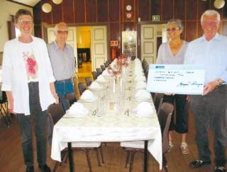 Men inden det hele gik i gang kiggede Helga Jørgensen fra Danske Bank i Glesborg (tidl. BG Bank) forbi med en check på de 5.000 kroner. På billedet ses hun yderst til venstre - ved et af de smukt dækkede borde - sammen med Villy Sørensen, Helga Jensen og Knud Erik Christensen fra bestyrelsen. Sidstnævnte er formand for bestyrelsen. Alt i alt har man investeret i nyt bestik og service for 15.000 kroner til forsamlinghuset i Glesborg.