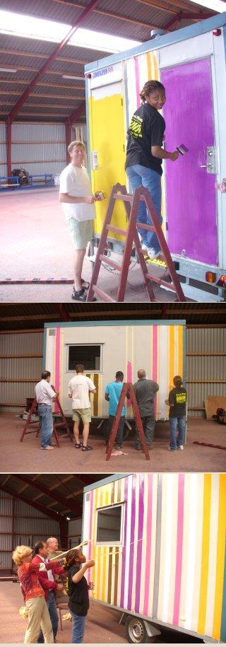 På halvanden dag blev en gammel skurvogn til en farvestrålende vogn, som nu ligger midt på torvet i Grenaa og fortæller om årets Global Festival 24.-25. august. To afrikanske børn, en kurdisk maler og to danske drenge sørgede for at male skurvognen. Alle fem arbejder frivilligt for at få Global Festival til at blive en stor succes.