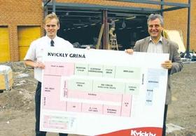 Kvickly Grenaa’s varehuschef, John Sørensen, og formanden for butiksrÃ¥det, Niels Erik Iversen, holder pÃ¥ herstÃ¥ende foto en stor planche, der viser, hvordan det nye Kvickly-varehus i Grenaa bliver indrettet.