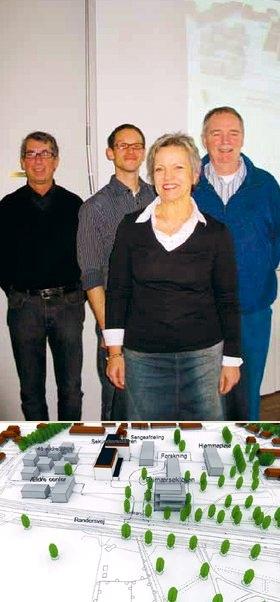 Her ses fire af de fem vækstgruppe-medlemmer, der var til stede ved pressemødet i Kulturhuset Pavillonen i Grenaa: Fra venstre er det Freddy Brask Sørensen, Thyge Truelsen, Anne-Mette Andersen og Peder Olesgaard. [nederst] Elever fra 3D-College har hjulpet Vækstgruppen Grenaa med at lave en computeranimeret udgave af deres sundhedscenter-forslag. Som det fremgår af tegningen er den gamle røde sygehusbygning fjernet for at blive erstattet af et nybyggeri på grunden.