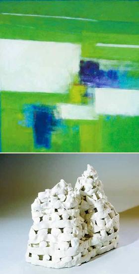 Eksempler på kunstværker af maleren Magda Høgh og keramikeren Jørgen Hansen, som udstiller i Baunhøj Mølle i Grenaa.
