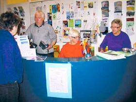 Hver formiddag fra mandag til og med torsdag kan man møde repræsentanter fra Ældre hjælper Ældre-ordningen ved skranken i Posthavecentret i Grenaa. På billedet ses Lis og Svend Busse og Tove Thomsen.