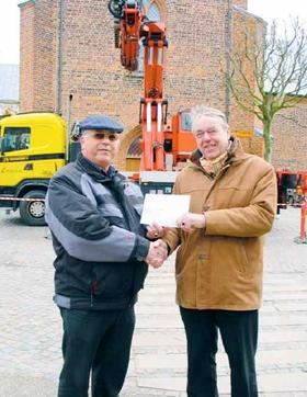 Årsagen til check-overrækkelsen kan antydningsvis ses i baggrunden i form af en lastbil med kran, idet der er tale om penge til etableringen af et udvidet klokkespil i tårnet til Sct. Gertruds Kirke på Torvet i Grenaa. De 14 nye klokker repræsenterer en stykpris på 20.000 kroner, så menighedsrådet har blandt andet været ude og låne 220.000 kroner af stiftet for at dække udgiften til de sidste klokker. Pengene til at afdrage lånet med skal menighedsrådet finde udenom kirkeskatte-midlerne, så derfor er sponsor-bidrag, som det Sparekassen Djursland leverer her på billedet, mere end velkomne. Desuden søger menighedsrådet diverse fonde for at hente penge hjem til projektet, ligesom man også arrangerer koncerter i Grenaa Kirke, hvor overskuddet går til netop klokkespillet. På den måde har menighedsrådet allerede indsamlet 70.000 kroner til at afdrage lånet med, men der er jo et stykke vej endnu, så potentielle sponsorer skal ifølge menighedsråds-formanden ikke holde sig tilbage.