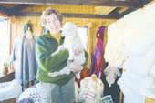 Inge Jenser og et lille mohair-kid på "søhøjgård" denne dag. Sædvanen tro vil der være slik og sodavand til børnene, mens der er sørge