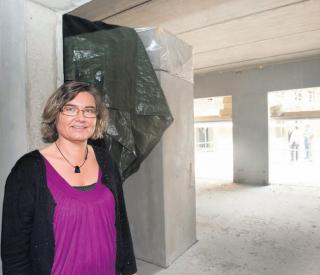 Plejehjemsleder Inge Burkhart fortæller om byggeriet af 86 nye ældreboliger i Digterparken i Grenaa på Ældredagen i Ørum Aktiv Center. Foto: Flemming Højer.