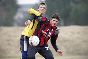 Fra træningskampen d. 12/3 på Grenaa Idrætscenter. FC Djursland - Aarhus Fremad: 0-0. Rune Nielsen fra Aarhus Fremad (tv) og Christoffer Hansen Foto: Ole Nielsen.