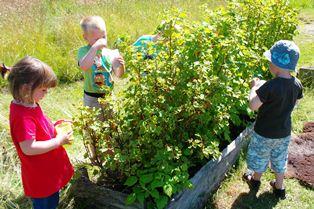 Via fotos, plancher og børnefremstillede høstprodukter kan man fornemme den glade travlhed omkring frugtbuske, køkkenhave, boblende og duftende gryder, arbejdsborde med pil, krydderurter og meget, meget mere…