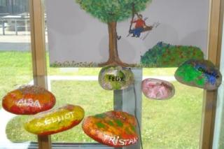 Hvert barn har dekoreret en sten til udstillingen. Børnene har vist deres