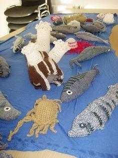Hæklede og strikkede fisk, planter og andre dyr, som findes ved Fjellerup Strand.