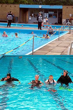 Friske dykkere på færde i svømmebadet samt hygge og musik i og ved bassinet.