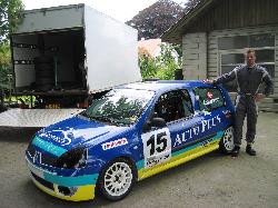 En tilfreds Bjørn Smedegaard Laursen med sin AutoPlus-Clio, som med sine 186 hk er en af klassens stærkeste biler. Iveco-lastbilen i baggrunden bruger Bjørn og hans team, BS Racing, til at transportere Renault Clio-raceren fra løb til løb.