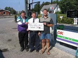Én gang årligt skifter det opsparede beløb hænder, som fremkommer ved at 3 øre pr. tanket liter på OK’s benzinkort med IFM-præference tilfalder de to holdsportsafdelinger. Nytegnede kort giver et afkast på 10 øre pr. tanket liter, og for al benzinkøb hos OK med de pågældende kort frigives en bonus på 50 kr. pr. tankede 400 liter til de to afdelinger. IFM's håndbold- og fodboldafdelinger kvitterer ved at hjælpe SuperBrugsen med forskellige arrangementer omkring benzinsalget i årets løb. På billedet modtager (til venstre) Knud Jensen som repræsentant for IFM håndbold og fodboldformand Kalle Jensen (til højre) checken med det flotte beløb, som helt sikkert vil blive modtaget med kyshånd af kassererne i de to IFM-afdelinger.