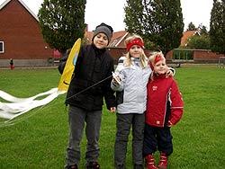 Søskendetrioen Frederik, Anna og Mette på henholdsvis ti, syv og fire år hjalp hinanden med at få deres fine drage op og flyve. Det blæste ikke en halv pelikan, men vejret var alligevel næsten perfekt