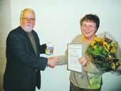 Formanden for GSI Mogens Buhl Christensen overrækker gave, diplom og blomster til Årets Idrætsleder 2005 i Grenaa Kommune, Bodil Nielsen fra Åstrup IF.