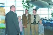 Kattegatcentrets direktør Peter Sand lykønsker familien Lund Hansen fra Broager med deres flotte præmie »HajNight de luxe«. Et aftenarrangement til en værdi af 40.000 kroner.