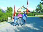 70 års jubilaren Harald mellem to FDF-fanerbærere. Han flankeres i den forbindelse af Lena Nedergaard og Alexander Nielsen. Lena er leder i FDF, mens Alexander er pilt.