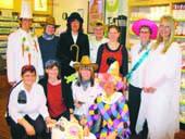 De ansatte var - som det fremgår af billedet - klædt ud til den helt store fastelavns-guldmedalje, så det i stedet for apoteks-assistenter og farmakonomer vrimlede med féer, engle, cowboys, kokke, kinesere og klovne med mere. Uden at det dog på nogen måde gik ud over fagligheden og kundebetjeningen, skal vi lige skynde os at sige!!