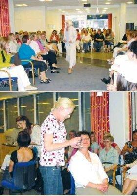 På billedet øverst ses Dorthe fra Danske Bank på Torvet som model i tøj fra butik »Louise«, mens man på billedet nederst kan se Bettina fra Bettina Beauty & Hair lægge makeup på en af deltagerne.