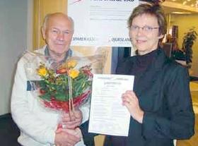 Vinderen blev Svend Rasmussen fra Åstrup. På billedet får Svend Rasmussen overrakt garantbeviset af Anne Grethe Slot fra Sparekassen Djursland, Grenaa Afdeling.
