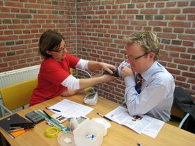 Det er kommunens sundhedsafdeling, som står bag tilbuddet, hvor blodtryk, BMI, fedtprocent, hofte-talje ratio, blodsukker, kulilte, kolesterol og konditionstal bliver målt i løbet af ca. en time. Det giver et indblik i sundhedstilstanden og et fingerpeg om, hvor man måske bør sætte ind med en ekstra indsats. De fleste har nok selv en fornemmelse af, om vægten er passende, men f.eks. forhøjet kolesterol (indholdet af fedt i blodet) rammer også slanke personer, så der er mange gode grunde til et sundhedstjek, uanset om man er overvægtig eller ej, forklarer Rikke Krogh og måler kommunaldirektørens BMI (forholdet mellem højde og vægt), der viser sig at ligge i den pæne del af normalområdet.