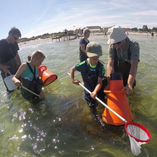 Hos Blå Flag Center ved Grenaa Strand kan man kl. 10 hoppe i et par waders og bevæger sig ud på det lave vand for at kigge på det rige dyreliv. Der er muslinger, krabber, snegle og småfisk. På en go dag ved kysten fanger man ofte 25 forskellige arter. Det er gratis at deltage.