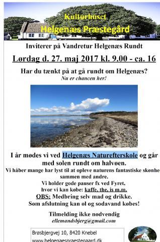 Har du tænkt på at gå rundt om Helgenæs ? - Nu er chancen her ! Kulturhuset Helgenæs Præstegård inviterer på Vandretur Helgenæs Rundt. - Oplev naturens fantastiske skønhed sammen med andre. I år mødes man ved Helgenæs Naturefterskole og går med solen rundt om halvøen. Der holdes gode pauser f. eks. ved Fyret, hvor man kan købe kaffe, the, is mm. OBS: medbring selv mad og drikke ! - Som afslutning kan øl og sodavand købes. Tilmelding er ikke nødvendig. Det er gratis at være med.