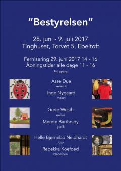 "Bestyrelsen" inviterer til fernisering på fællesudstilling i Tinghuset i Ebeltoft. Fra den 28. juni 2017 indtager den nyoprettede kunstnergruppe"Bestyrelsen" Tinghuset i Ebeltoft. "Bestyrelsen" udgøres af Asse Due (keramik), Grete Westh (maleri), Helle Bjørnebo Neidhardt (foto), Inge Nygaard (maleri), Merete Bartholdy (grafik) og Rebekka Koefoed (blandform). Medlemmerne af "Bestyrelsen" er en fasttømret gruppe, som i en årrække har været en del af bestyrelsen i Kunstnersammenslutningen Åbne Døre. - Der er gratis adgang.