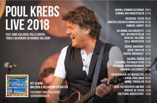 POUL KREBS & BAND - LIVE 2018. Poul Krebs skriver om sin turné: "Vi har sådan set bare ladet de nye sange fortælle deres egen lille historie - har så indspillet dem på små stoppesteder langs vejen, på en lang KrebsFalch turne. Jeg har kaldt mit nuværende band for mit "drømmehold" - det tror jeg, de fleste vil forstå, når de hører det nye album. Når folk omkring dig spiller som de gør, må man sgu tage sig sammen for at skrive nogle ordentlige sange. Og de sange der er kommet på det nye album råber bare på at blive spillet live - så det bliver en fornøjelse, at præsentere både nye og gamle sange for publikum ved forårets koncerter". - Entré: 320 kr. - Unge under 22 år kan få UNGBILLET i forsalg for 275 kr. ved fremvisning af gyldigt ID.