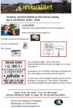 Foredrag om livskvalitet i Kulturhuset Helgenæs Præstegård den 8. juli kl. 14-16 ved Doris Beltoft og Chris Nunan. "Hvad vil det sige at have et godt liv? Er lykken en fed bankkonto? En varm hundehvalp? Eller snevejr? Kan vi selv gøre noget - eller er det vores forældre/børn/chef/samfundet, der afgør, om vi trives i vores eget liv? Foredraget er et mix af fakta, holdninger og dialog med dem der møder op, med det formål at inspirere. Doris Beltoft og Chris Nunan synes selv, de har et dejligt liv og deler gerne ud af de erfaringer, de har gjort, ikke mindst i forbindelse med deres pludselige flytning til Helgenæs sidste sommer. - Alle er velkomne! - Foreningen Kulturhuset Helgenæs Præstegård har arrangeret. - Entré: 75 kr. - Medlemmer dog kun 50 kr.