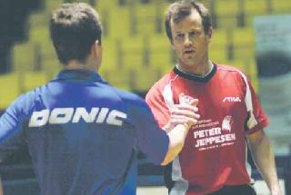 Waldner er efterhånden blevet 40 år, men spiller ikke desto mindre stadig på et meget højt niveau. Var således med på Sveriges landshold ved det nyligt afholdte hold-VM i Tyskland. For nylig stillede han sammen den østrigske kineser - eller også er det omvendt - Chen Wei Cheng, op til et bordtennis-show i Randers-Hallen. Det skete som et led i en større Europa-turné, hvor de to verdensklassespillere spiller en række opvisnings-kampe mod spillere fra de byer/områder, som showet besøger. Frank Jensen spiller til daglig for Randers Freja i den danske 2. division, og blev som sådan udtaget til at stille op til kamp som den ene af to lokale spillere. Der var tale om et fint arrangement med cirka 1000 tilskuere, så cirka 2.000 øjne klistrede sig til hver en bold, der blev spillet i dysten mellem Frank fra Grenaa og verdensstjernen J. O. - som er hans svenske kælenavn.