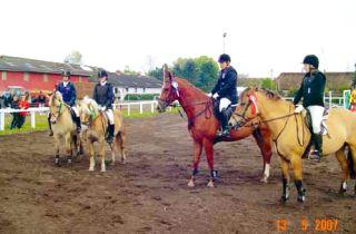 På billedet ses de placerede ryttere i springklassen Begynder 1 pony/hest. Dog mangler Anne Sørensen på billedet. Placeringer dressur: LD med hjælp 1. Henriette Hansen 2. Nanna M. R. Nielsen. 3. Caroline Kjeldsen Lerdahl. Beg. 1 Elevhest 1. Helene Bjerregaard. 2. Sara Svith Dahl. Beg. 2 Elevhest