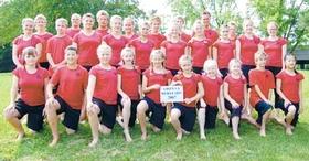 Grenaa Gymnasterne var klædt godt på til turen. Flotte røde T-shirts var venligst sponseret af Grenå Bilhus A/S, og gymnasternes sorte bukser var sponseret af Bogart.