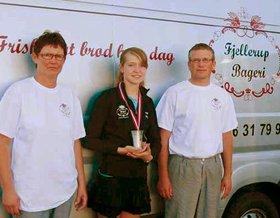Den 19-årige Carina Koch Andersen med sin DM-pokal og -medalje. Hun får god støtte af Fjellerup Bageri, der har sikret mange skud fra hende i fremtiden ved bl.a. at sponsorere 5.000 patroner. Indehaverne af Fjellerup Bageri er Pia Rasmussn og Mogens Hansen.